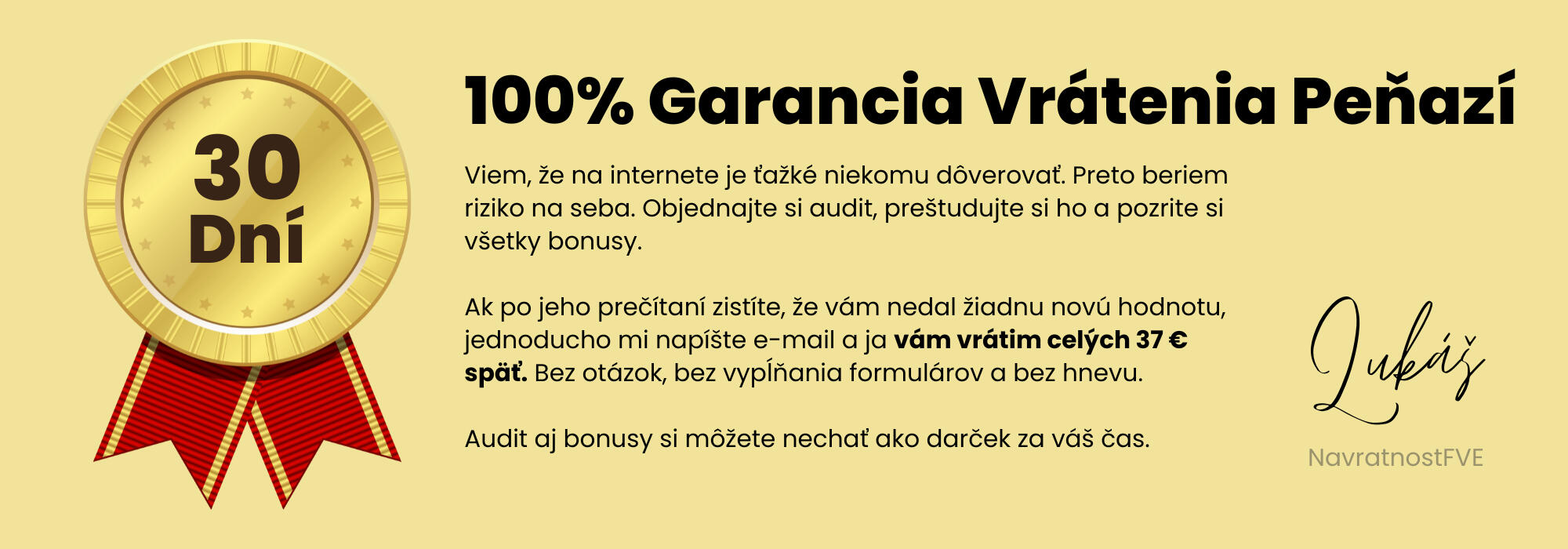 Prečo taká nízka cena? Kde je háčik?Žiadny háčik v tom nie je. Službu Návratnosť FVE práve spúšťam a mojím cieľom je vybudovať si silné portfólio spokojných klientov.Preto som sa rozhodol prvým zákazníkom ponúknuť kompletný audit aj so všetkými bonusmi za túto symbolickú "zavádzaciu cenu".A aby bolo toto rozhodnutie pre vás naozaj bez rizika, pridávam k tomu moju osobnú 30-dňovú garanciu vrátenia peňazí. Ak by ste s auditom neboli spokojní, jednoducho mi napíšete a ja vám vrátim peniaze.